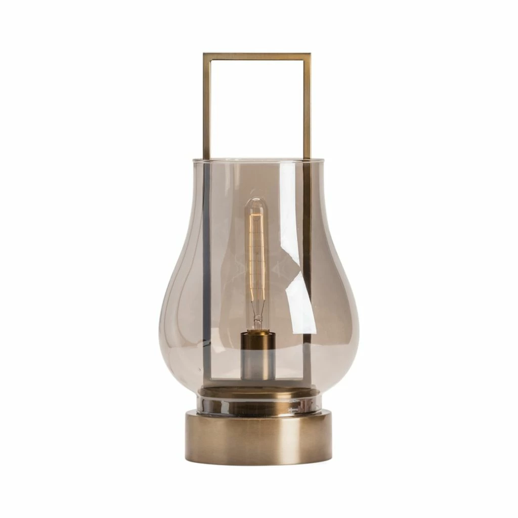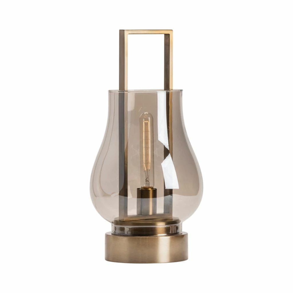 - Curved smoky glass lens drapes upward from the base over the bulb